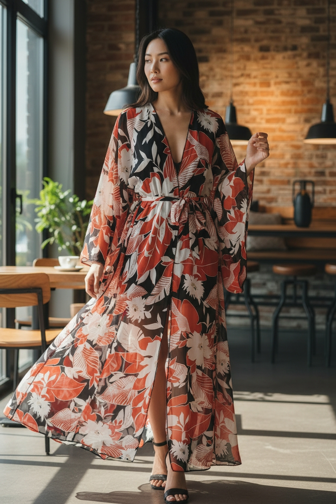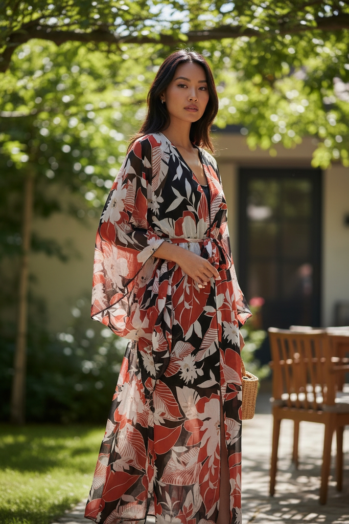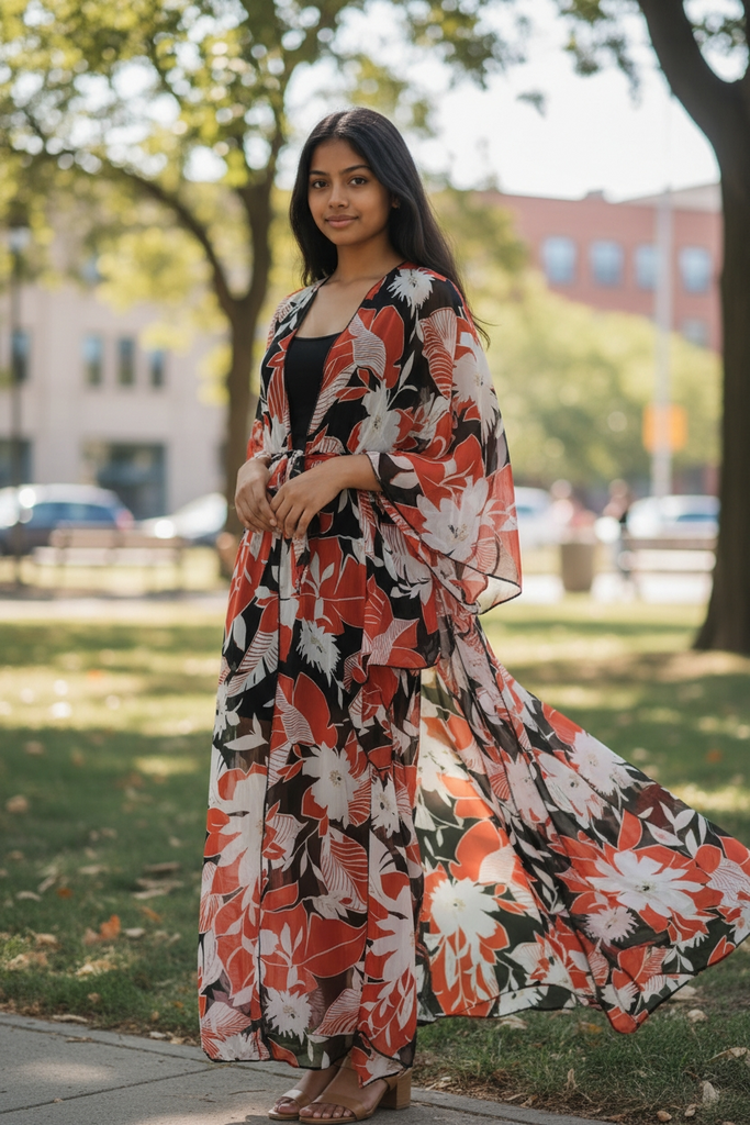Wrap yourself in effortless elegance with the Lolita Flow Floral Chiffon Duster, a lightweight statement layer designed for movement, grace, and versatility. Crafted from airy chiffon, this flowing duster features a bold floral print in rich, earthy tones that elevate any look from simple to striking.